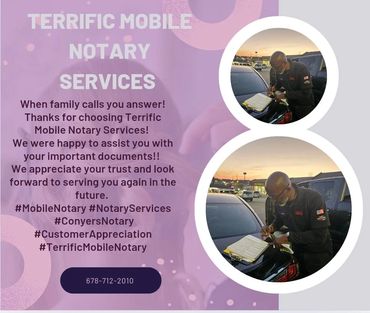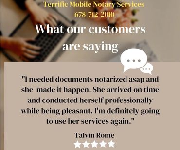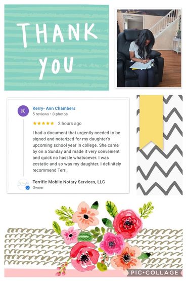 At Terrific Mobile Notary Services, we take pride in offering dependable and accessible notary services tailored to fit your schedule and location. Whether you're at home, in the office, or need a document notarized in a hurry, we’re here to serve with accuracy, efficiency, and a smile.